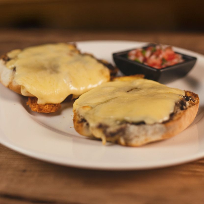 Molletes con queso manchego gratinado, acompañado con pico de gallo