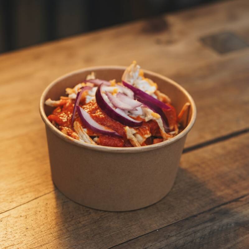 Salsa roja con ALMENDRAS y chile morita, servidos con HUEVO y POLLO, queso, crema y cebolla. Acompañados de frijoles.