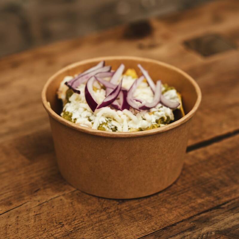 Salsa verde de tomate, queso, crema y cebolla. Acompañados de frijoles.