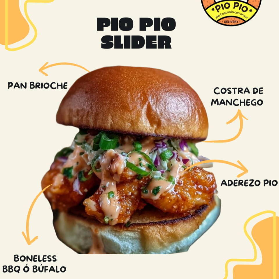 Mini hamburguesita con boneless bañados con salsa bufalo o BBQa elegir con manchego y aderezo pio