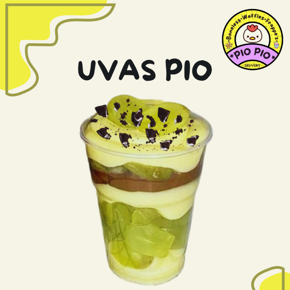 Riquísimas uvas con nuestra crema dulce PIO acompañadas de tus 2 toppings favoritos y chispas de chocolate