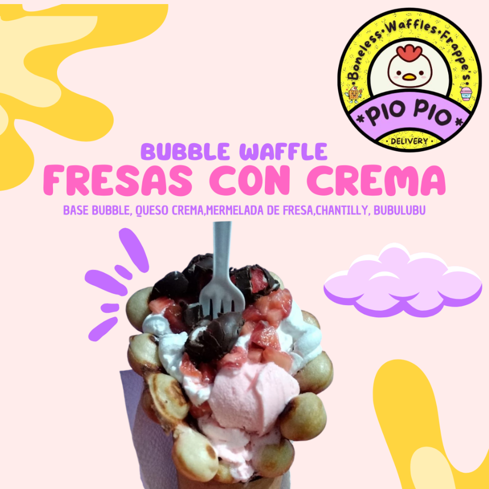 Waffle calientito con base de Philadelphia, fresas troceadas, helado de fresa, crema batida y bubulubu