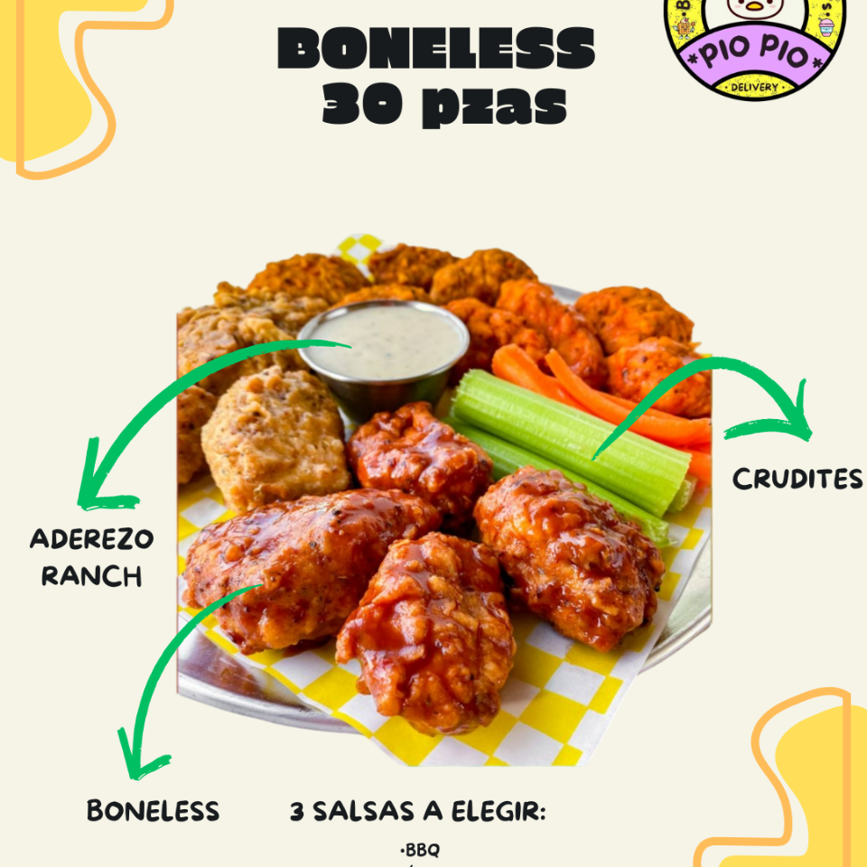 Treinta boneless bañados y crujientes con 3 de tus salsas favoritas acompañados de vegetales y aderezo ranch