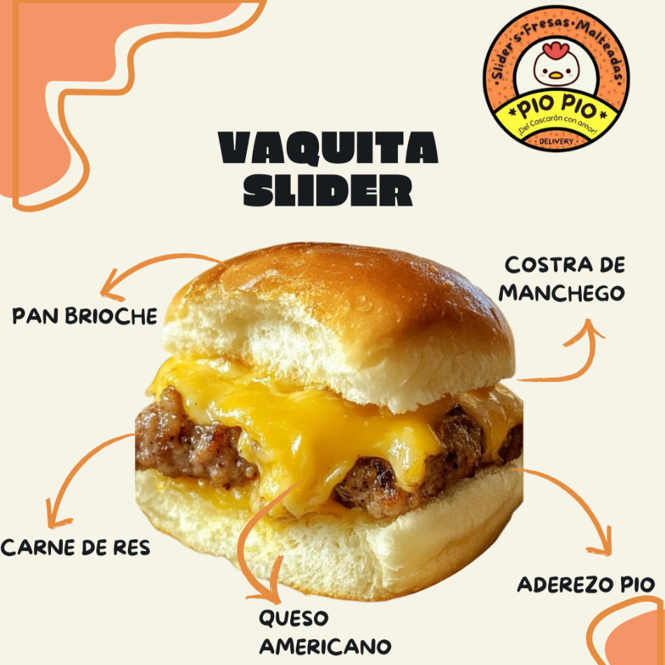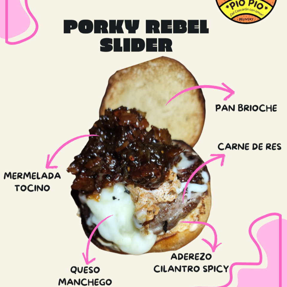 Mini hamburguesa con carne Angus, queso americano, cebolla asada y aderezo pio