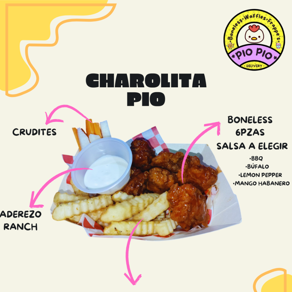 Seis boneless bañados y crujientes con tu salsa favorita con krispy fries, vegetales y aderezo ranch