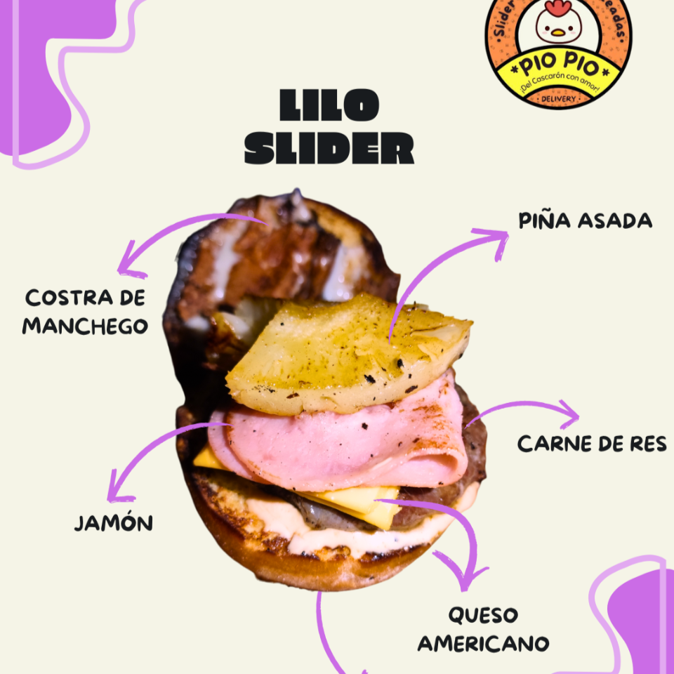 Mini hamburguesa con carne Angus, jamón, queso americano y piña asada