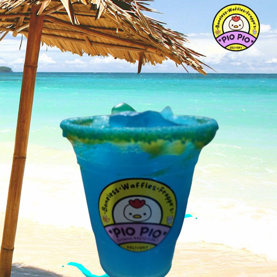 Frappe refrescante de chicle con jugo de limón, powerade y soda escarchado con miguelito y jalea de mora azul