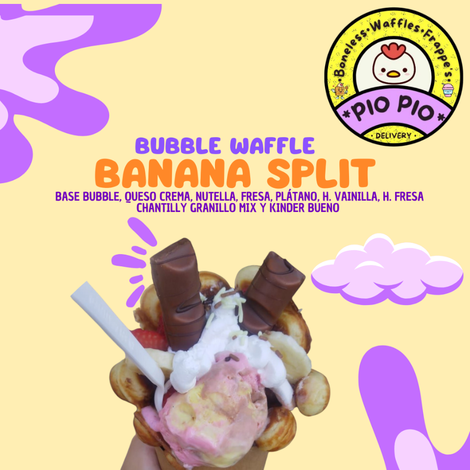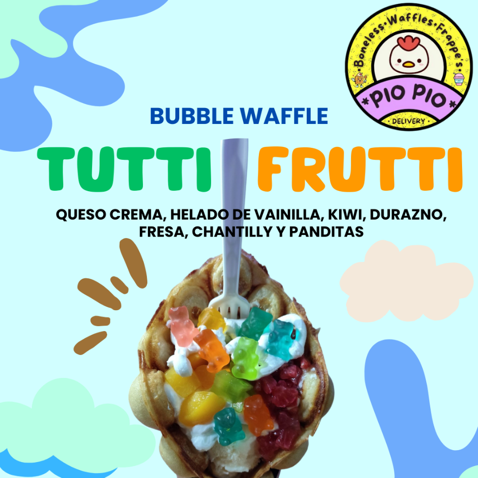 Waffle calientito con base de Philadelphia, helado de vainilla, kiwi, fresas, durazno, crema batida y gumys