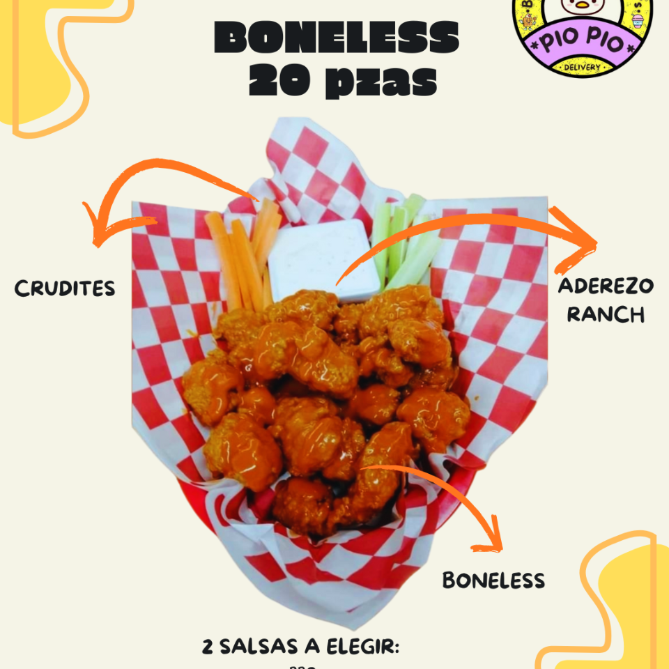 Veinte boneless bañados y crujientes con dos salsas a elegir acompañados de vegetales y aderezo ranch