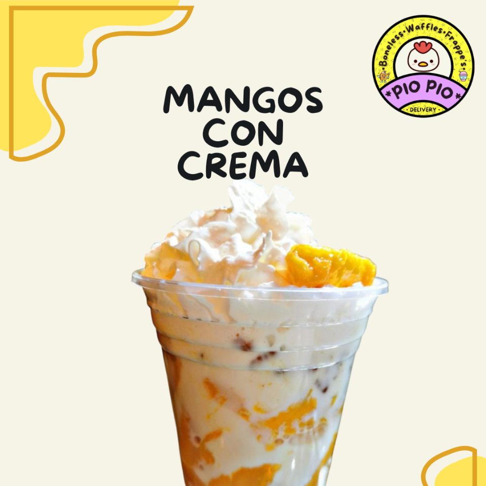 Deliciosos trozos de mango con nuestra crema dulce PIO y tus 2 toppings favoritos