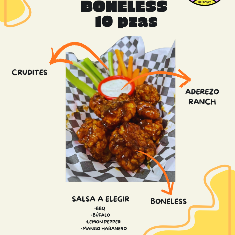 Diez Boneless bañados con tu salsa favorita a elegir, acompañados de vegetales y aderezo ranch