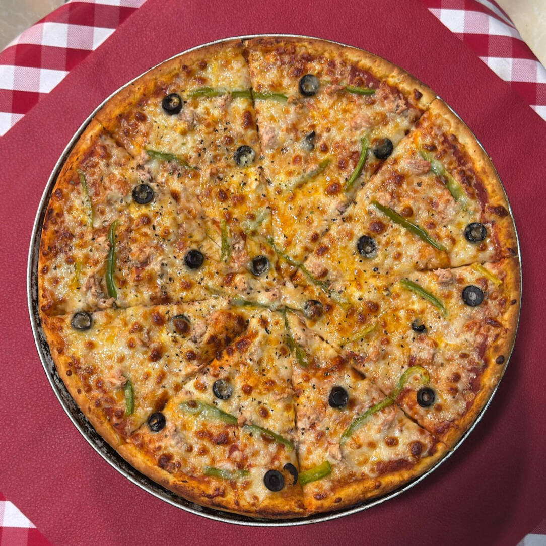 Pizza mediana de 28 cm con atún, cebolla, aceituna negra y pimiento verde.