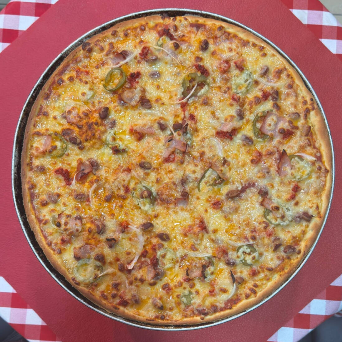 Pizza familiar de 40 cm con tocino, chorizo, frijol, cebolla y jalapeño, con el toque picante justo.