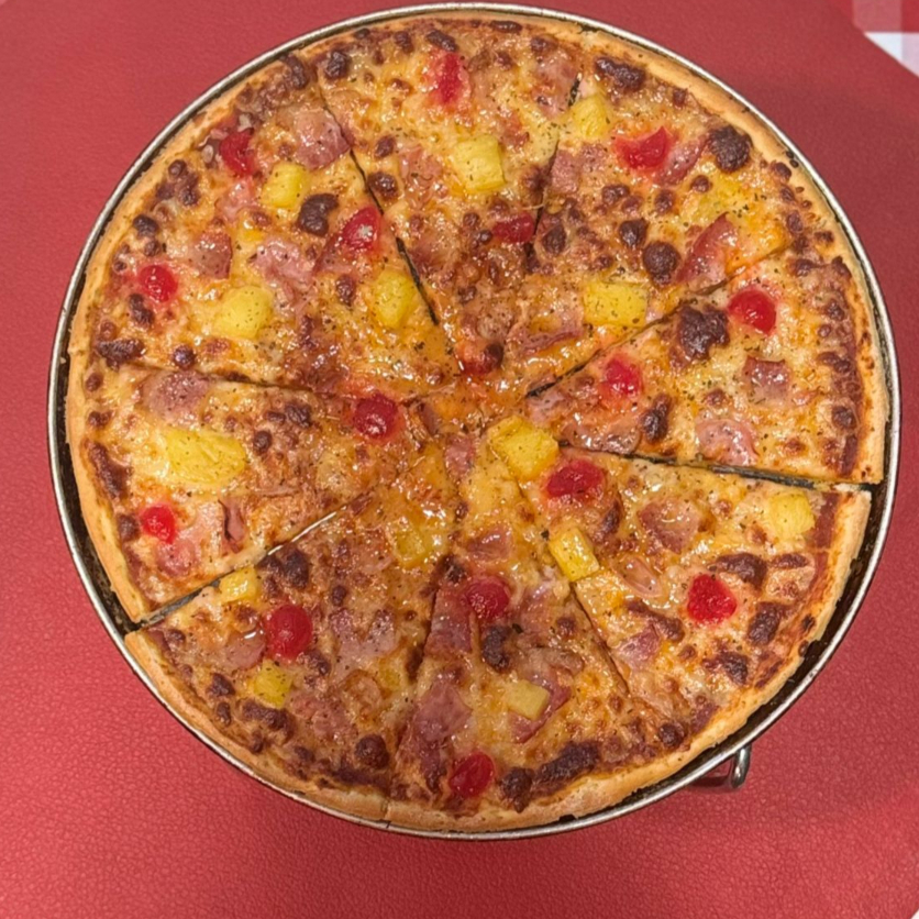 Pizza familiar de 40 cm con jamón, tocino, piña y cereza en base de salsa de tomate artesanal.