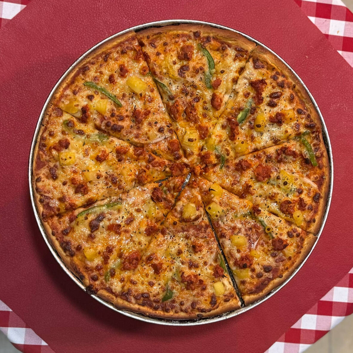 Pizza mediana de 28 cm con carne al pastor, piña, pimiento, cebolla y toque de pimiento verde.