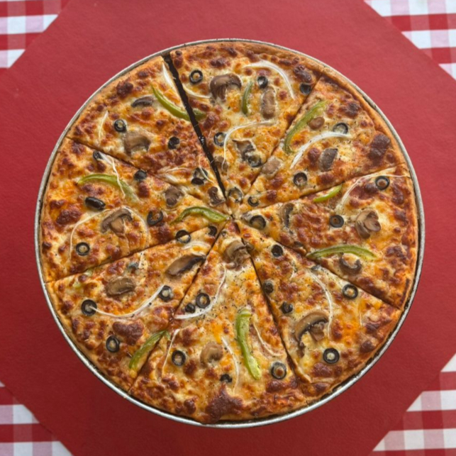 Pizza grande de 33 cm con champiñones frescos, aceituna negra, cebolla y pimiento verde.