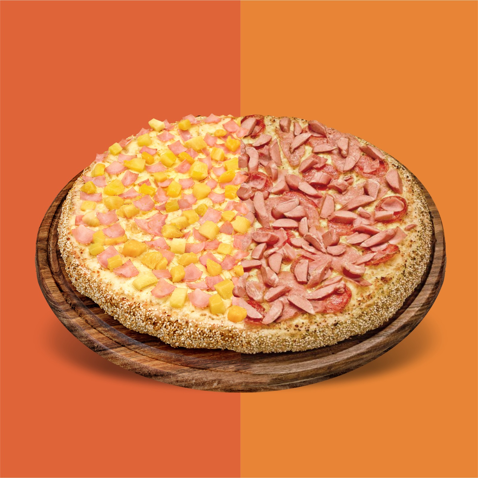 Pizza de 12 Rebanadas. Ingredientes: mitad jamón, mitad salchicha.