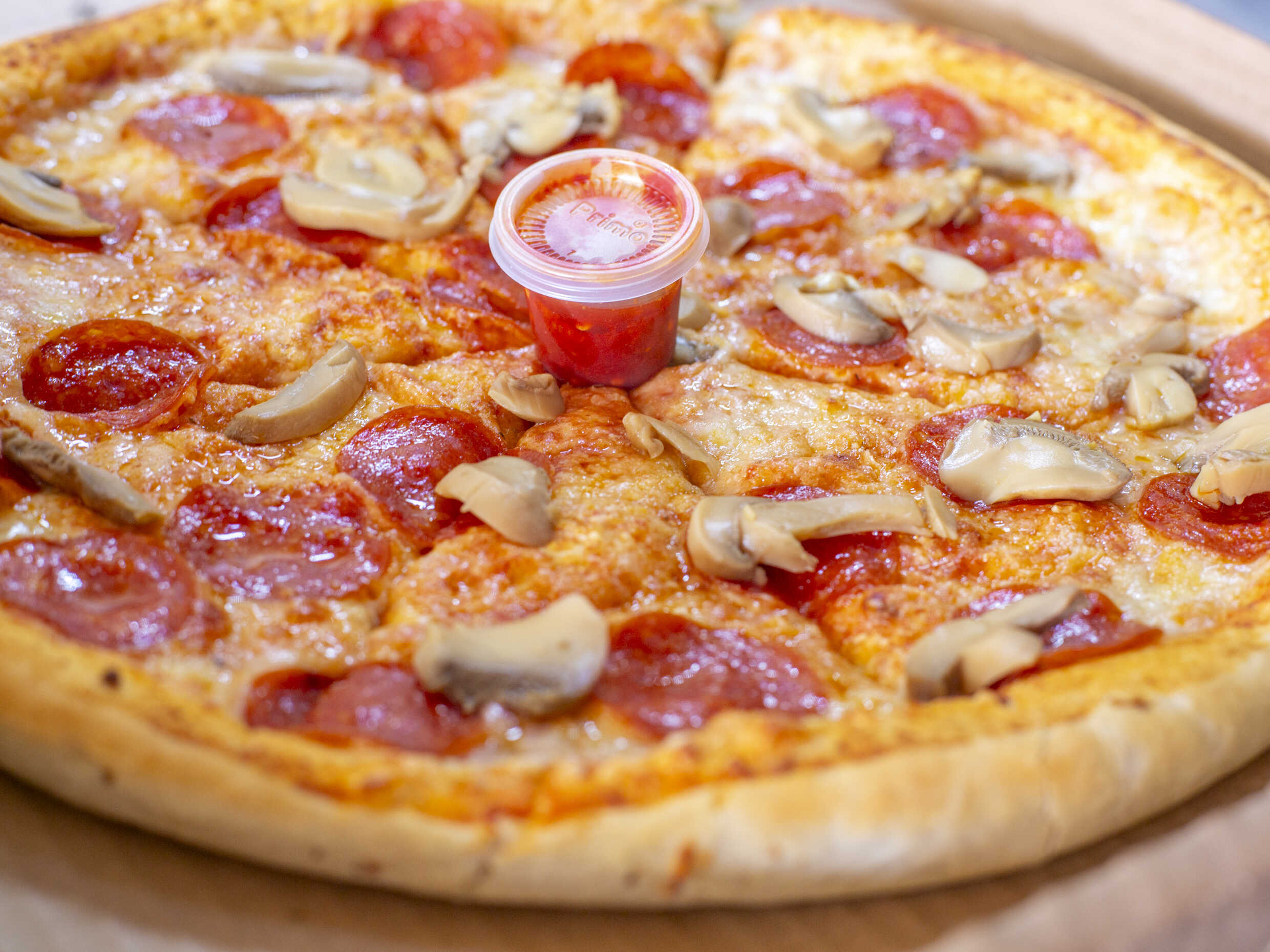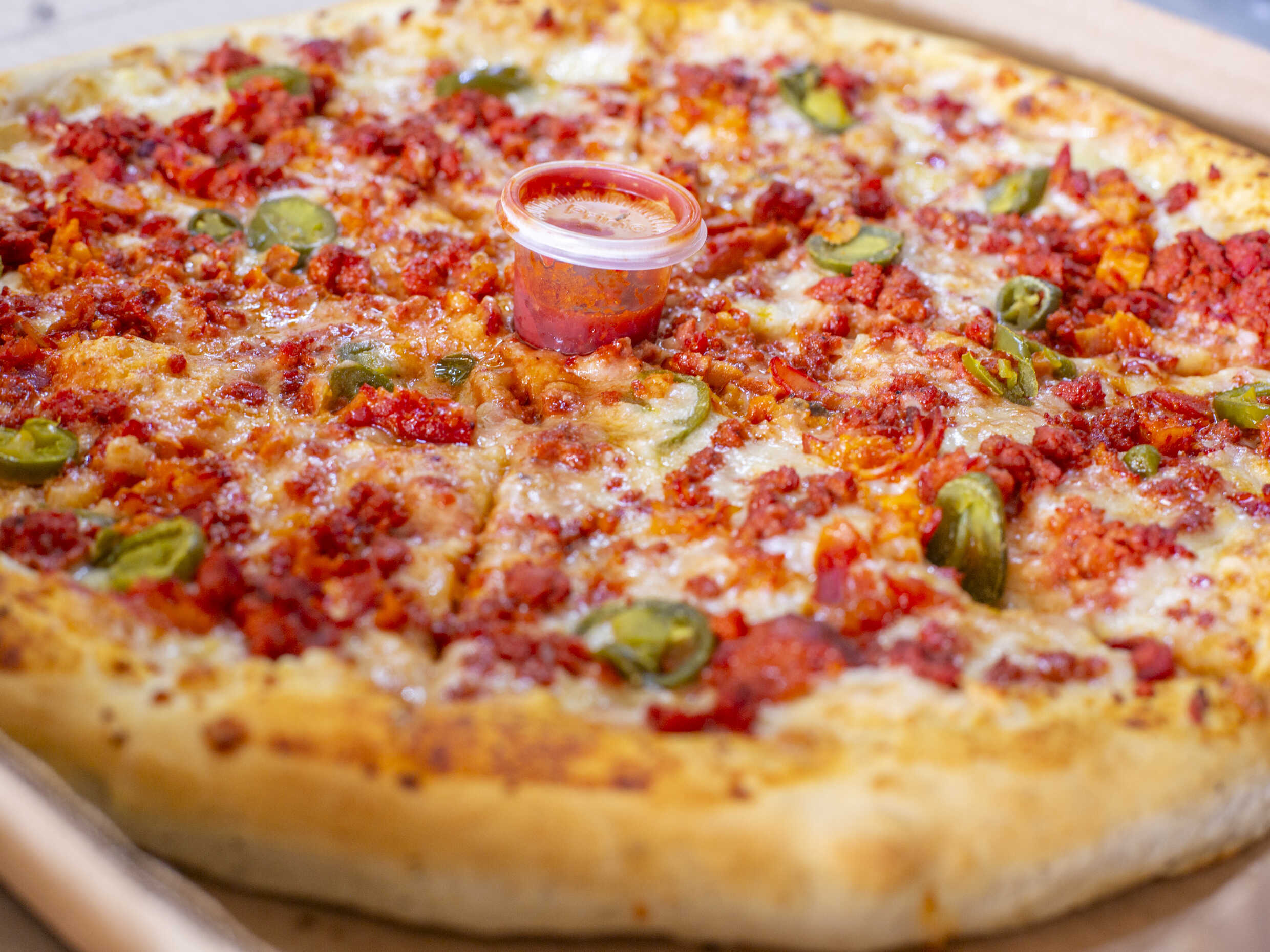 Pizza de 8 rebanadas con chorizo, tocino, rajas, salsa picante por separado.