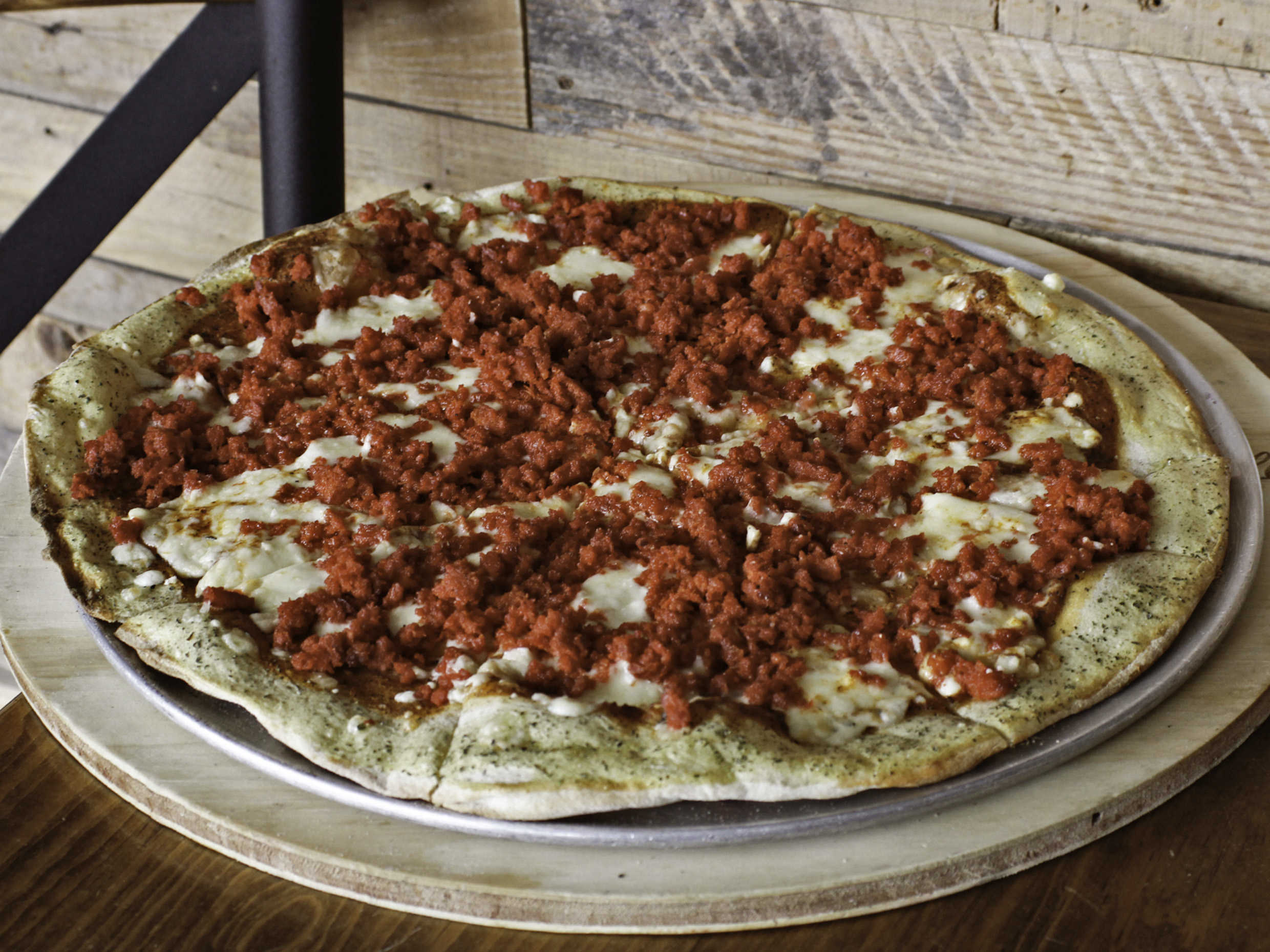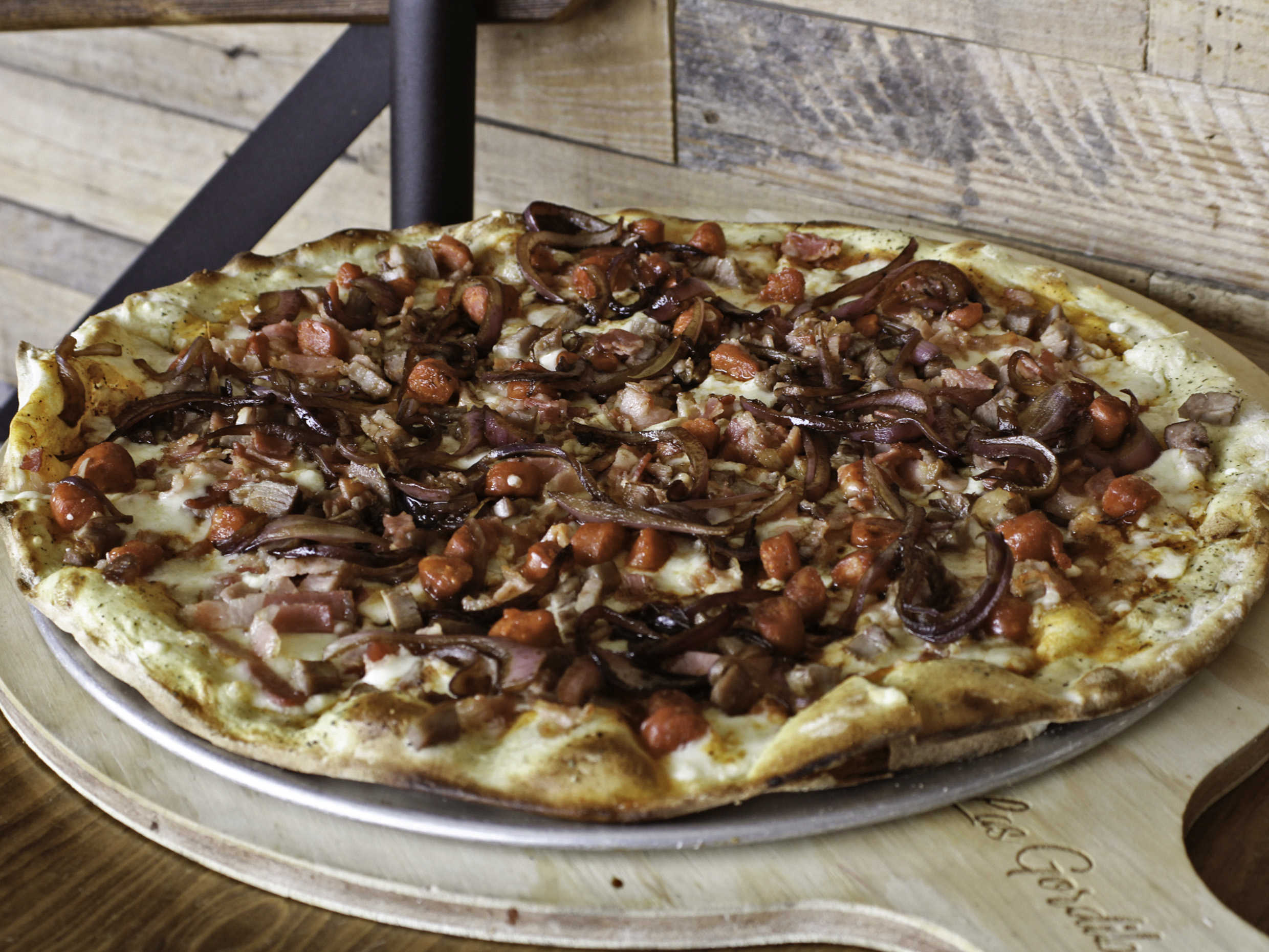 Pizza chica. Tocino, chistorra, arrachera y cebolla caramelizada.