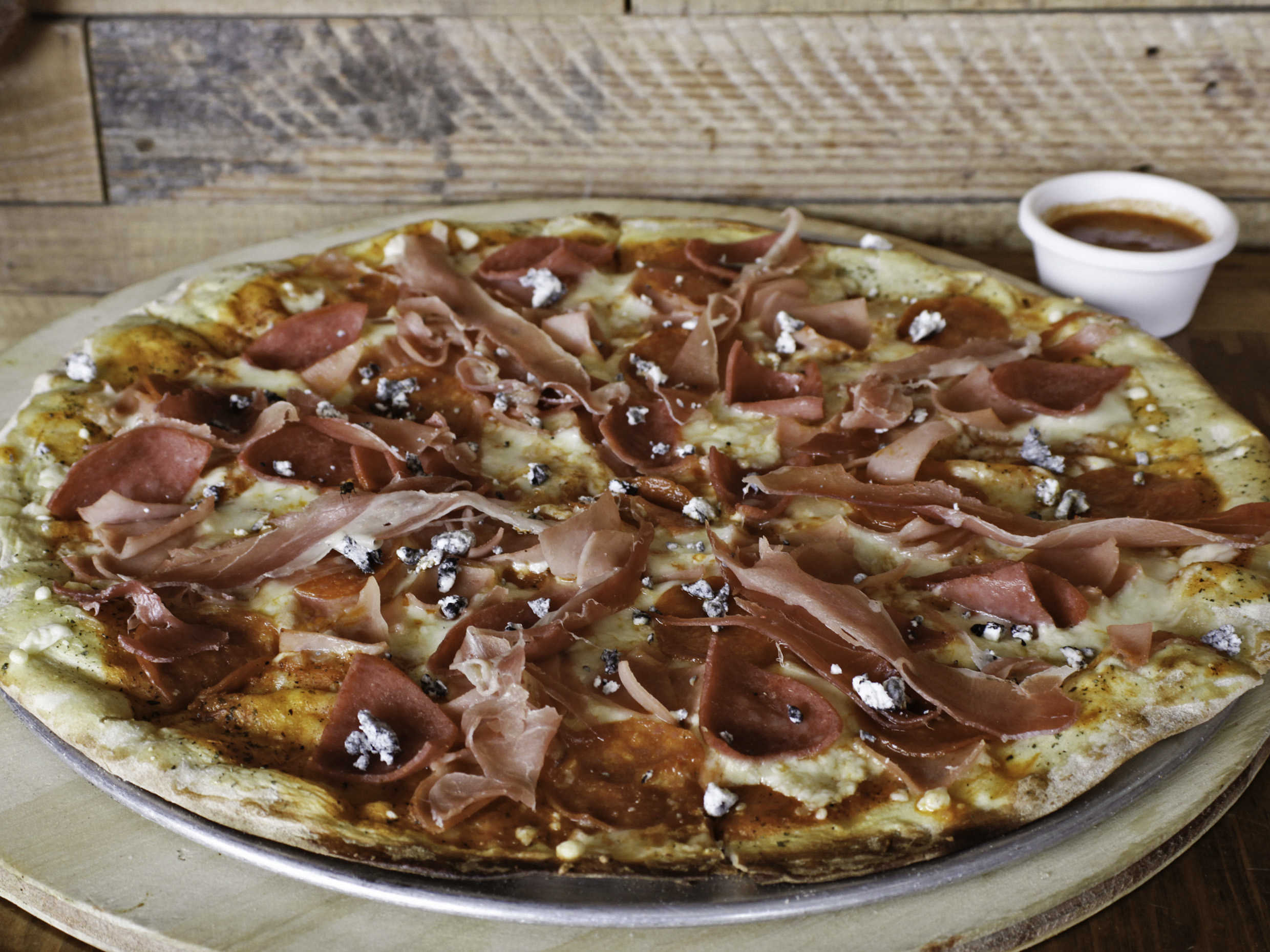 Pizza chica. Jamón serrano, salami, pepperoni, chispas de queso de cabra.