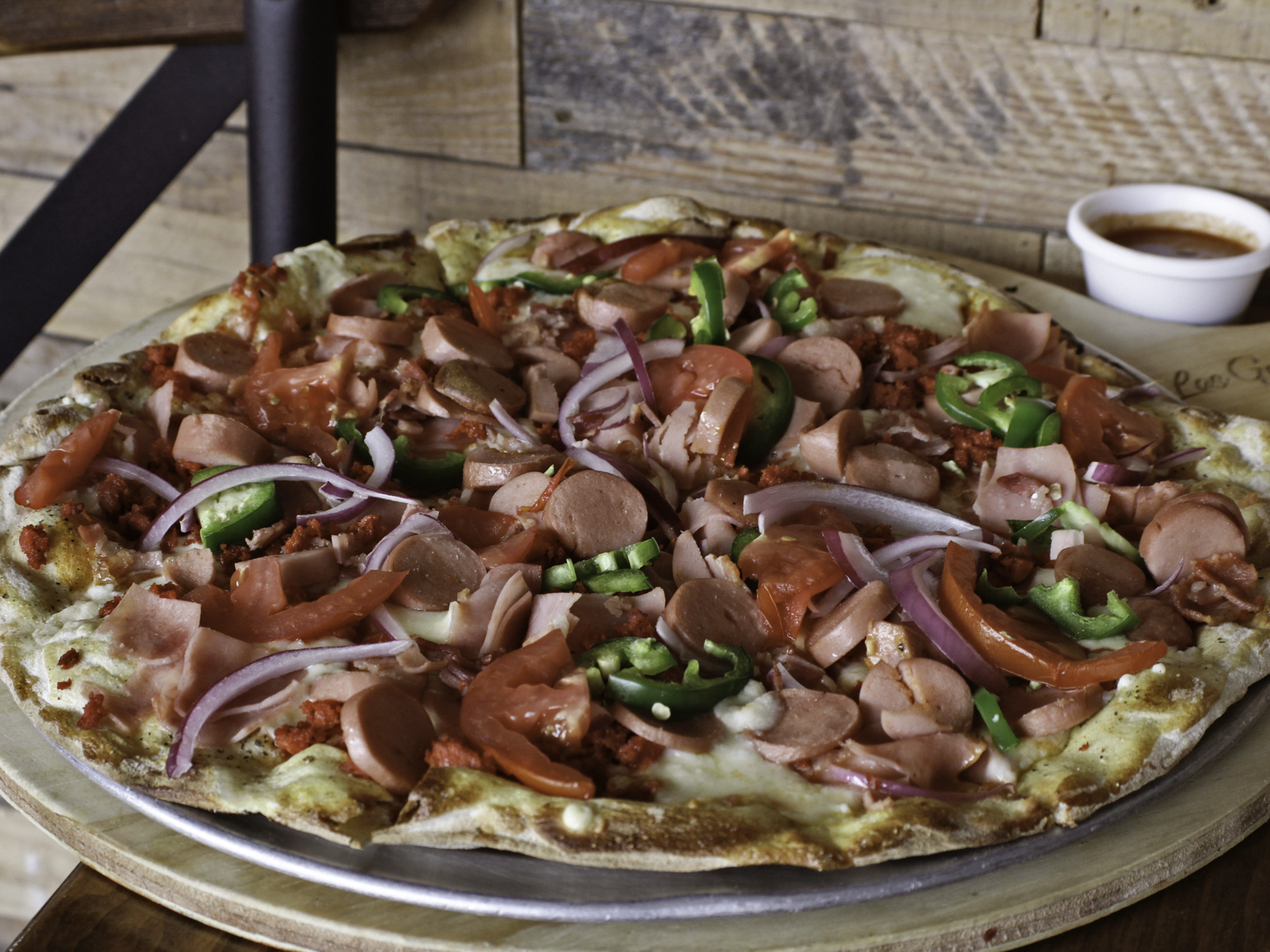 Pizza chica. Chorizo, salchicha, jamón, tocino, jitomate, cebolla y jalapeños.