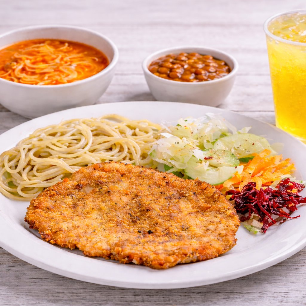 Crujiente milanesa empanizada, acompañada de una porción chica de chilaquiles a elegir verdes o rojos, preparados con queso y crema, más ensalada fresca. Un platillo completo, llenador y muy al estilo de casa.
