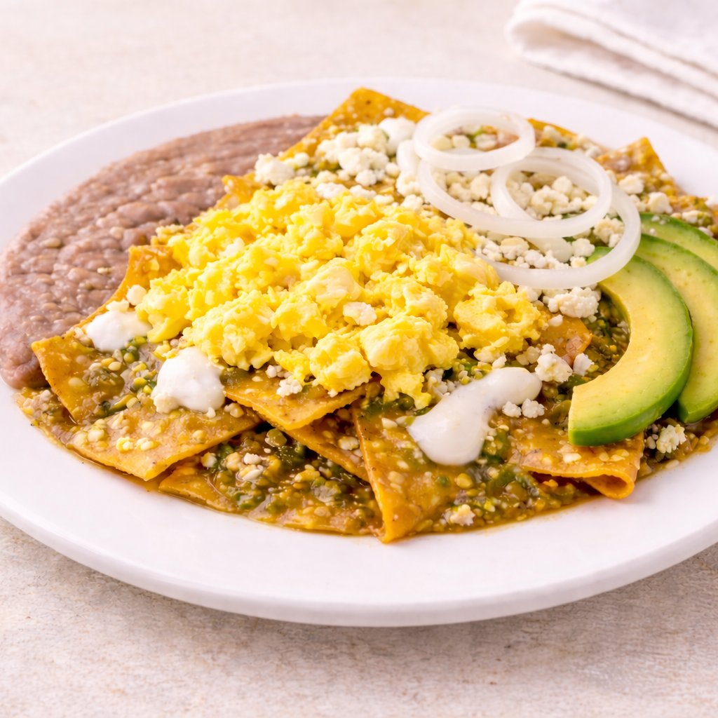 Chilaquiles con huevo revuelto, servidos con frijoles refritos, salsa a elegir, queso panela, crema, cebolla y aguacate.