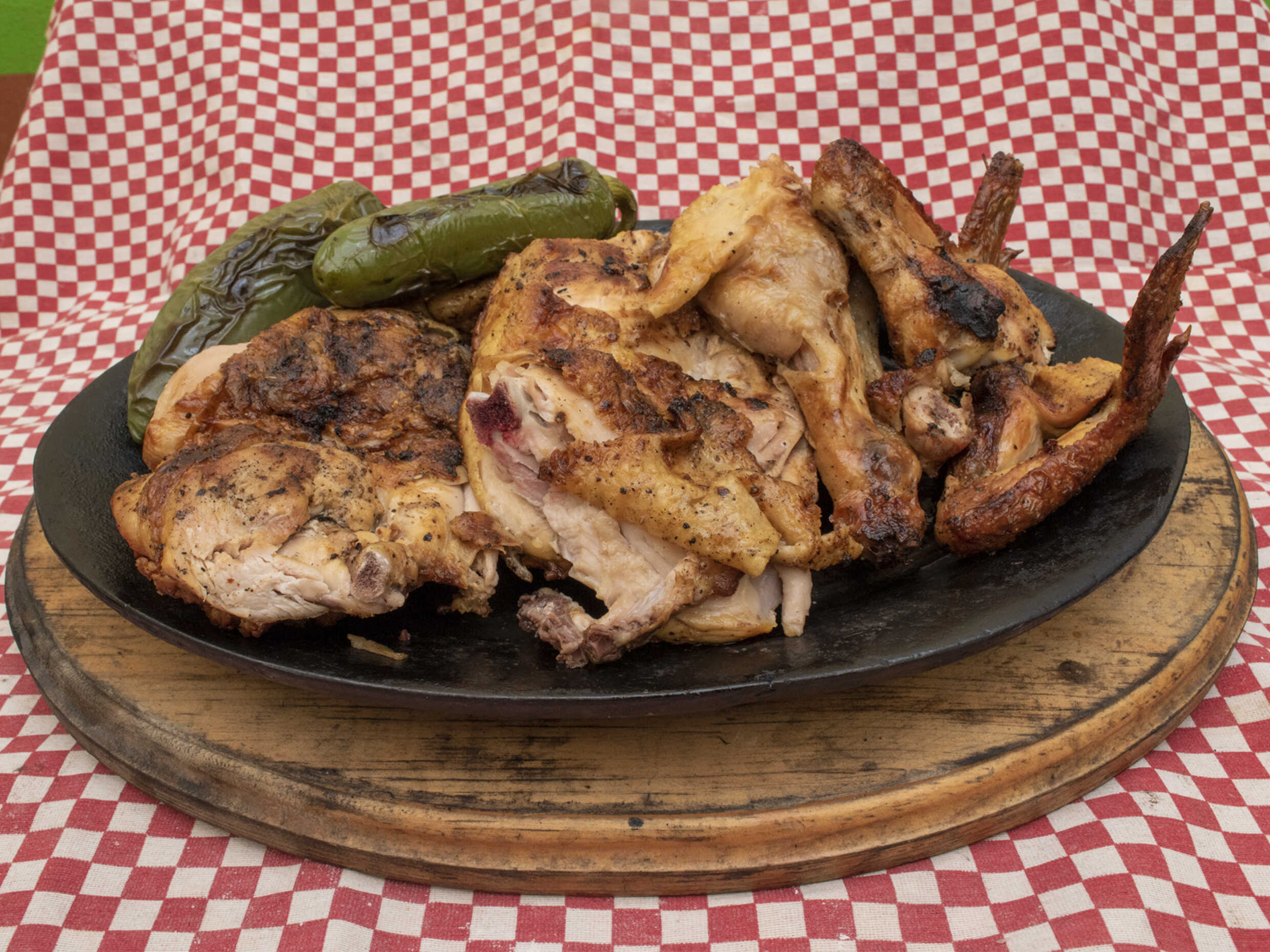 1 pollo asado y 1/2 (pierna y muslo). Incluye salsa, tortillas, totopos y chiles toreados.