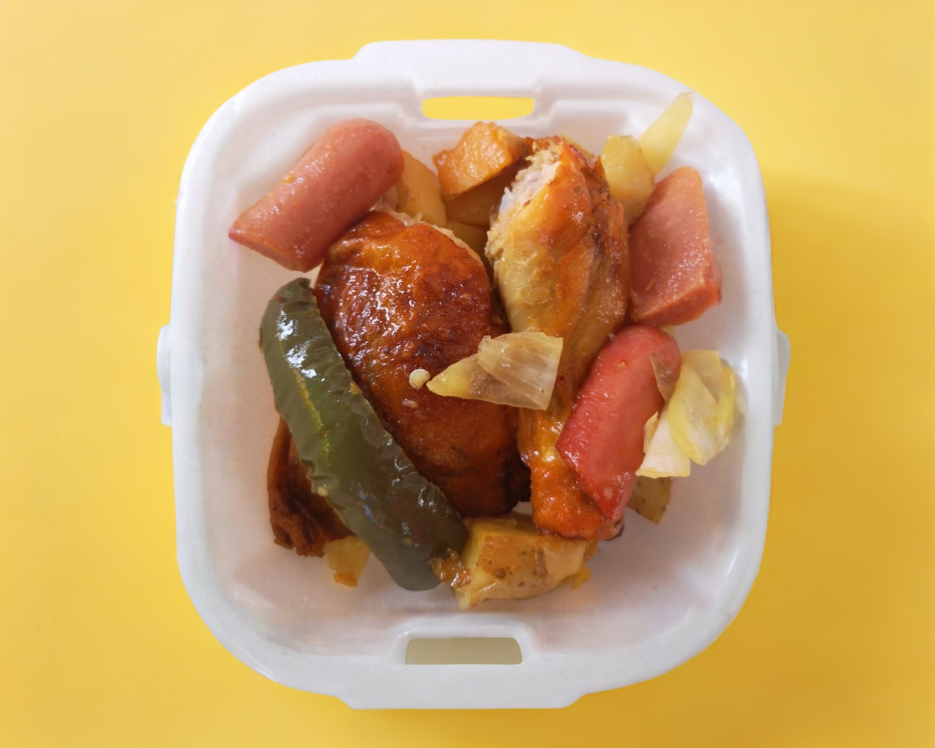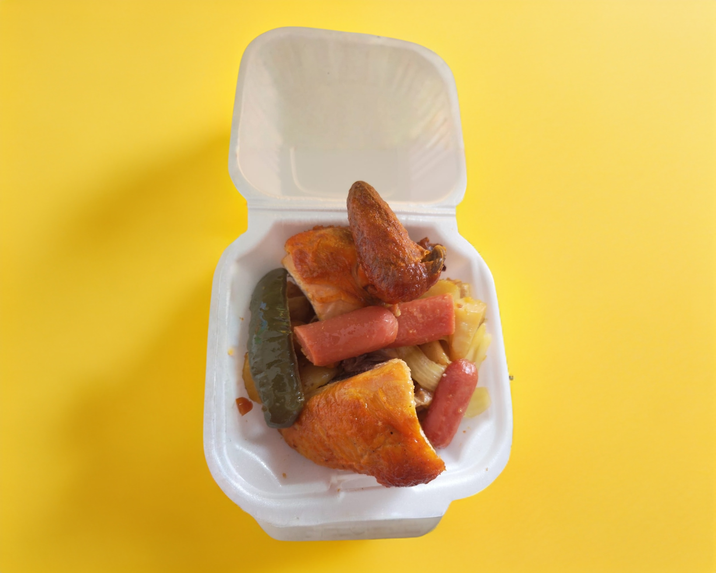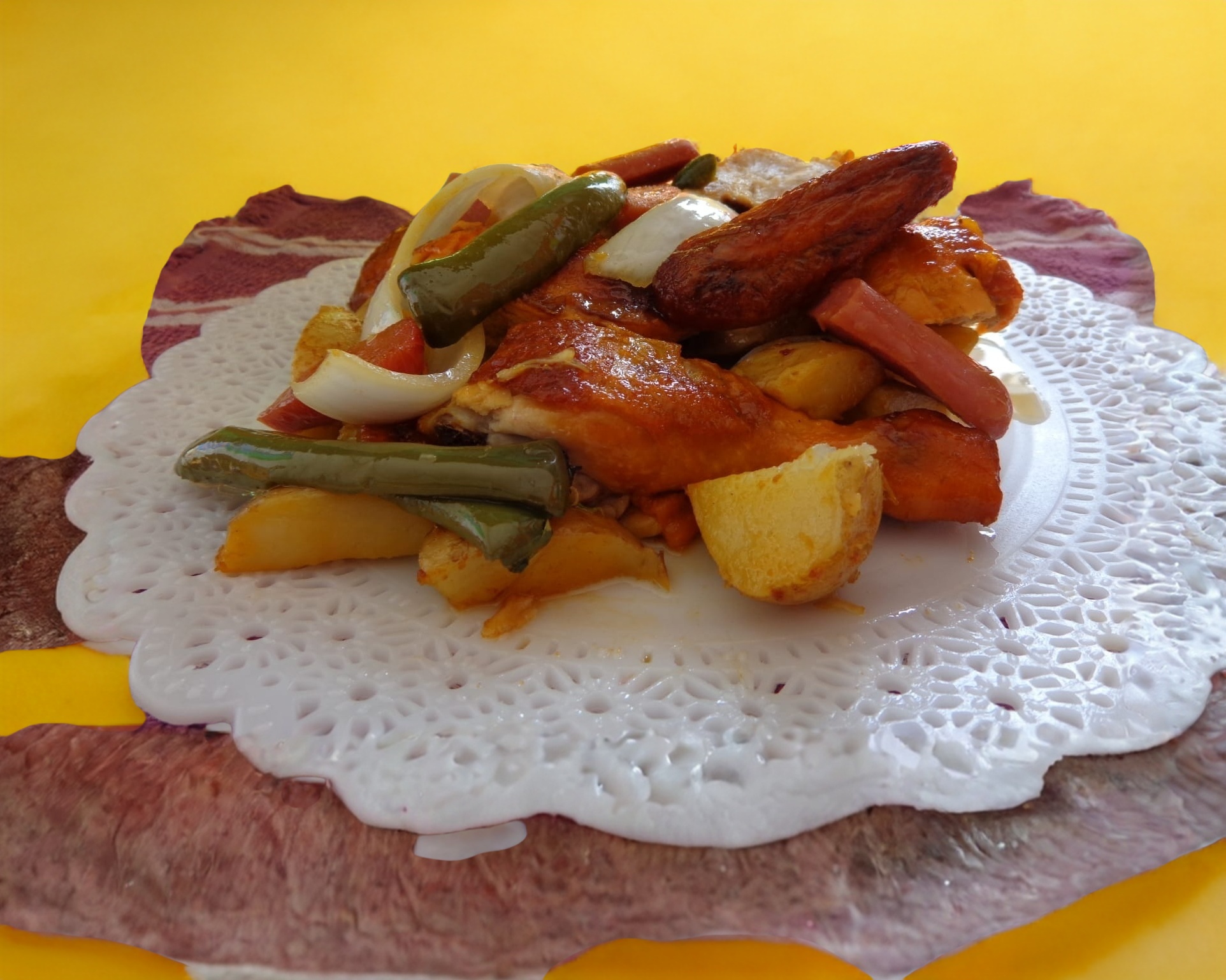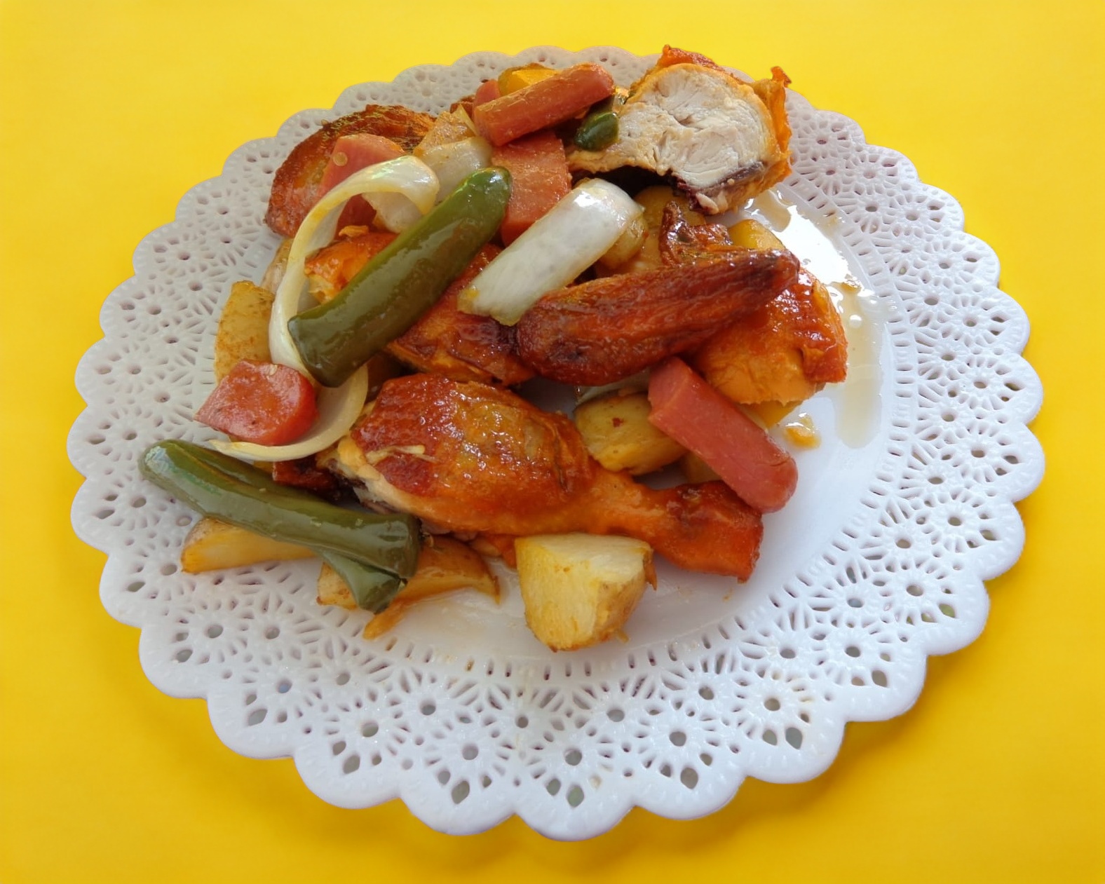 1 Pollo entero, acompañado de papas, chiles, cebollas, salchichas, tortilla y salsa.