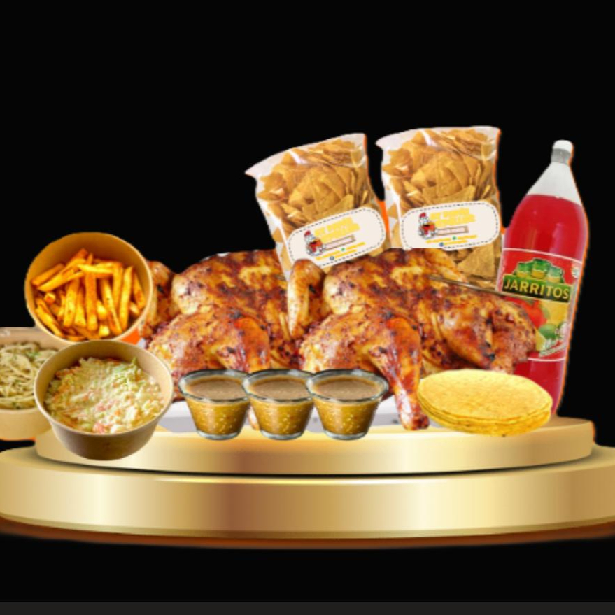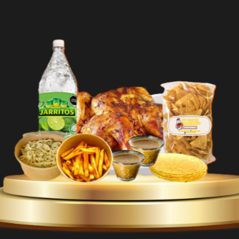 1 pollo incluye tortillas, salsas, totopos y cebollitas acompañado con 2 complementos spaguetti y papas ala francesa y lleva 1 refresco de 2l