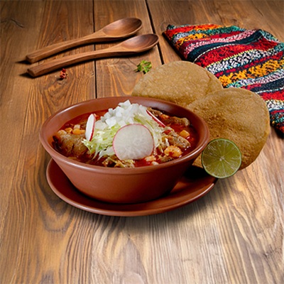 Con carne de cerdo surtida, acompañado con tostadas, lechuga, rabano, chile de árbol, orégano y limón.