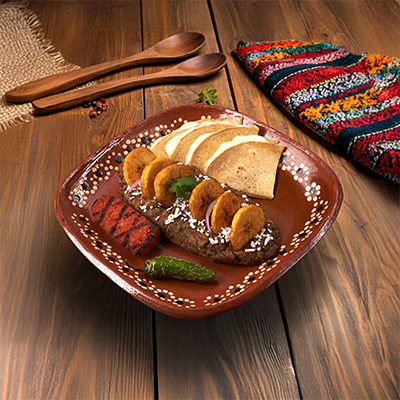 2 huevos revueltos, con frijoles refritos negros con queso rallado, 4 miniquesadillas, chorizo, platano macho frito y chile toreado