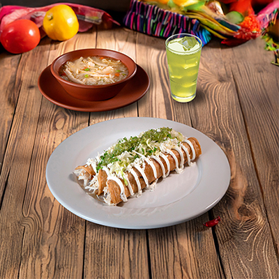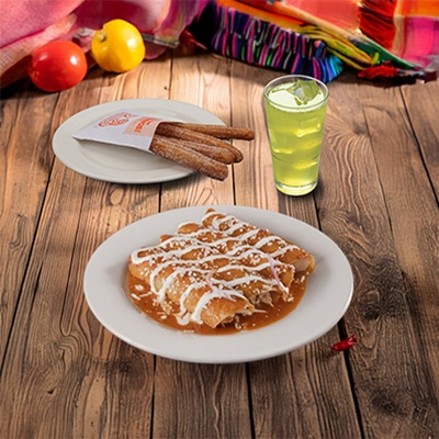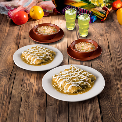 Incluye 2 sopas de fideo o consome, 2 enchiladas rojas o verdes y 2 bebidas.