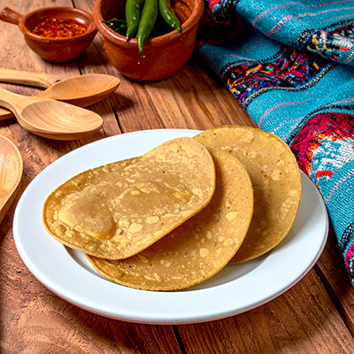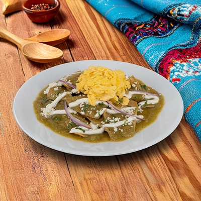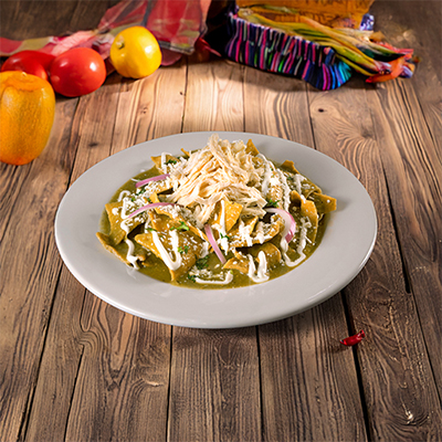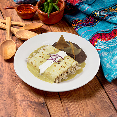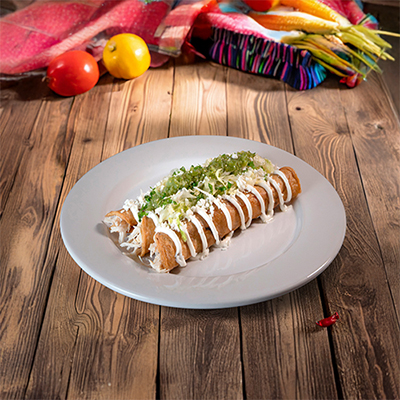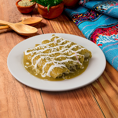 Servido con lechuga, queso, crema y salsa verde cruda.