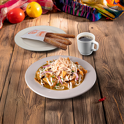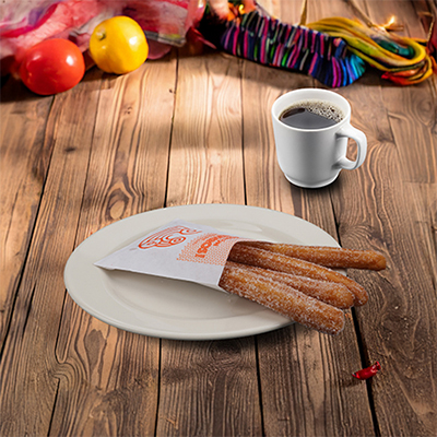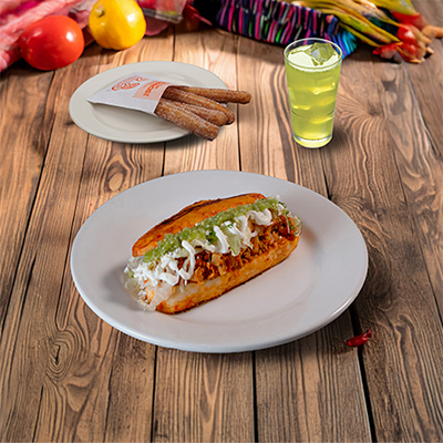 Incluye un pambazo de papas con chorizo + bebida + churros