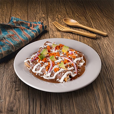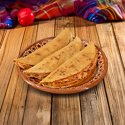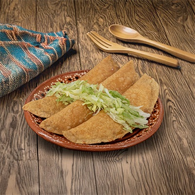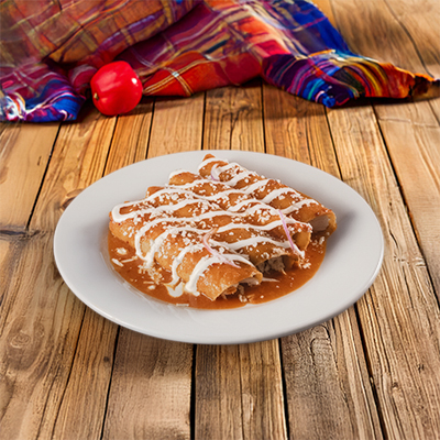 4 piezas con nuestra salsa especial cremosa, rellenas de pollo guisado, gratinadas con queso gouda, crema y frijoles refritos