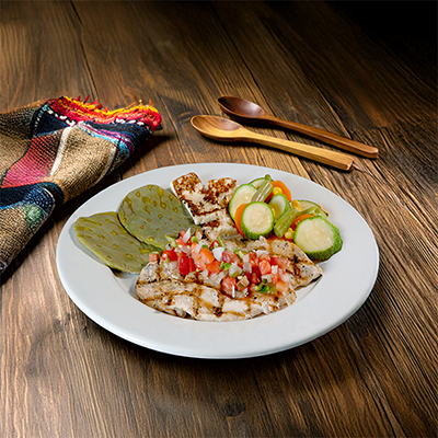 Acompañada de calabazas parrilladas, queso panela y nopales asados con salsa mexicana