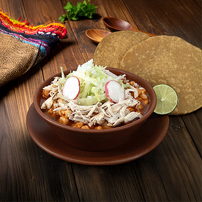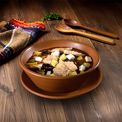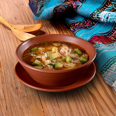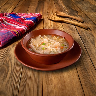 Nuestro tradicional caldo servido con pollo, garbanzo, queso, arroz, aguacate, cilantro y cebolla.
