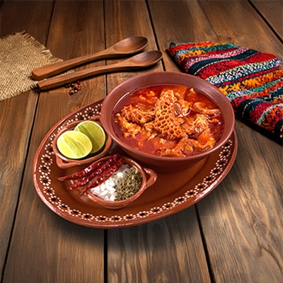 Pancita de res (500ml) servida con cebolla,chile de árbol,orégano y limones.