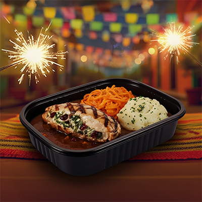 Pechuga horneada rellena 200gr con queso, crema, espinaca, arandano y tocino , acompañado de espagueti rojo y puré de papa