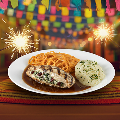 2 Pechugas horneadas rellenas 200gr con queso, crema, espinaca, arandano y tocino , acompañado de espagueti rojo y puré de papa