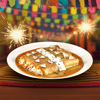 4 enchiladas de pollo en salsa ranchera cremosa, gratinadas y acompañadas de arroz blanco