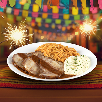 Tradicional lomo de cerdo adobado 150g acompañado de espagueti rojo y puré de papa