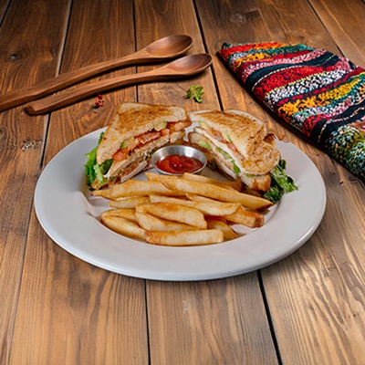 Crujiente sandwich con jamón, queso, tocino, jitomate, lechuga, aguacate acompañado de papas fritas.