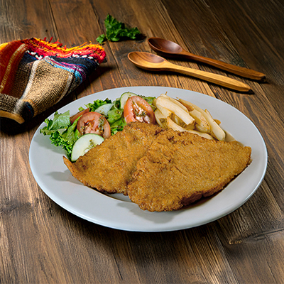 Acompañada de ensalada mixta con vinagreta de poblano rostizado y papas fritas
