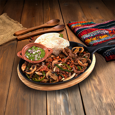 Bistec de res (120g) con chorizo, champiñones, cebolla, poblano. Salsa verde cruda y tortilla de harina