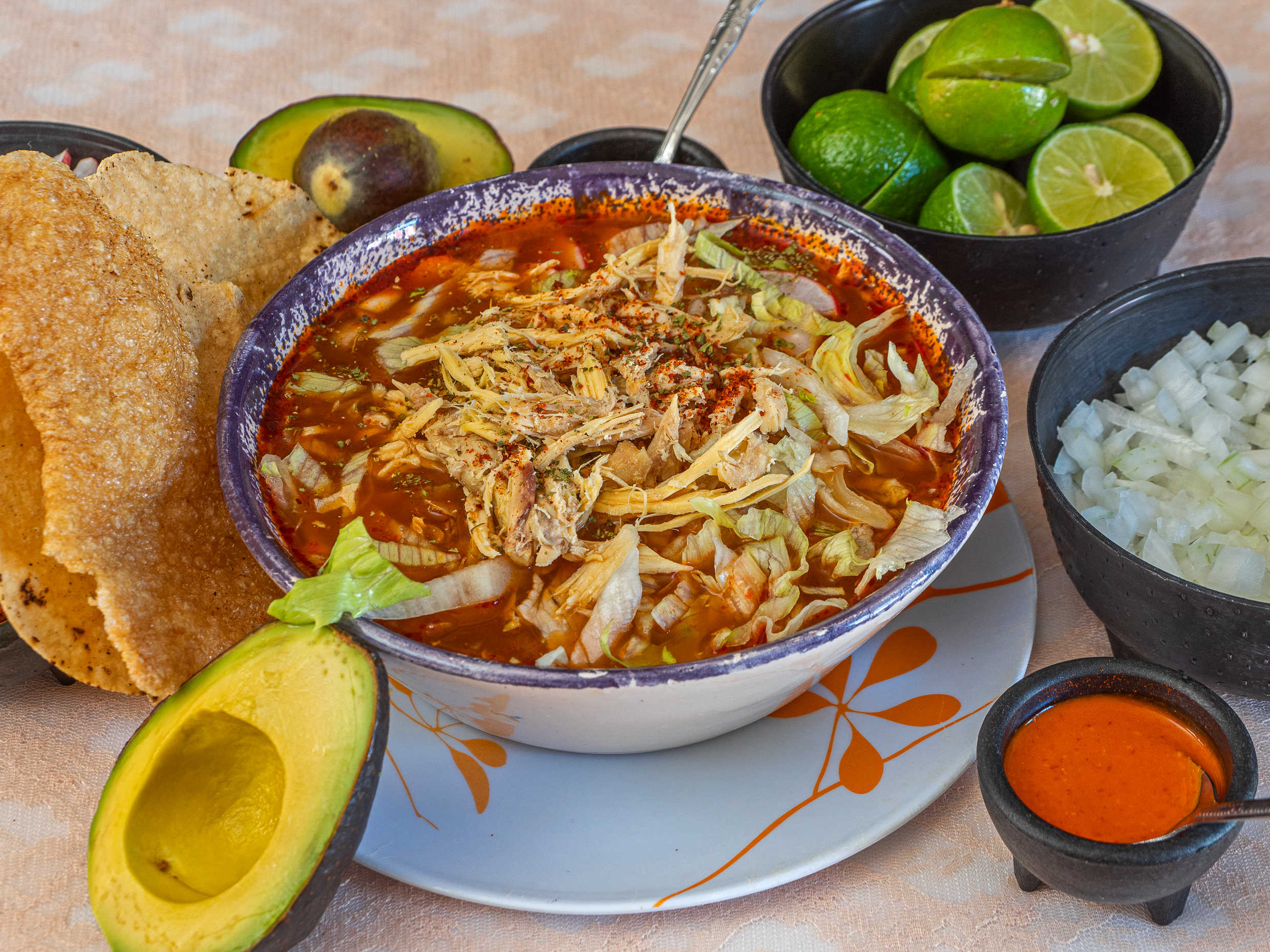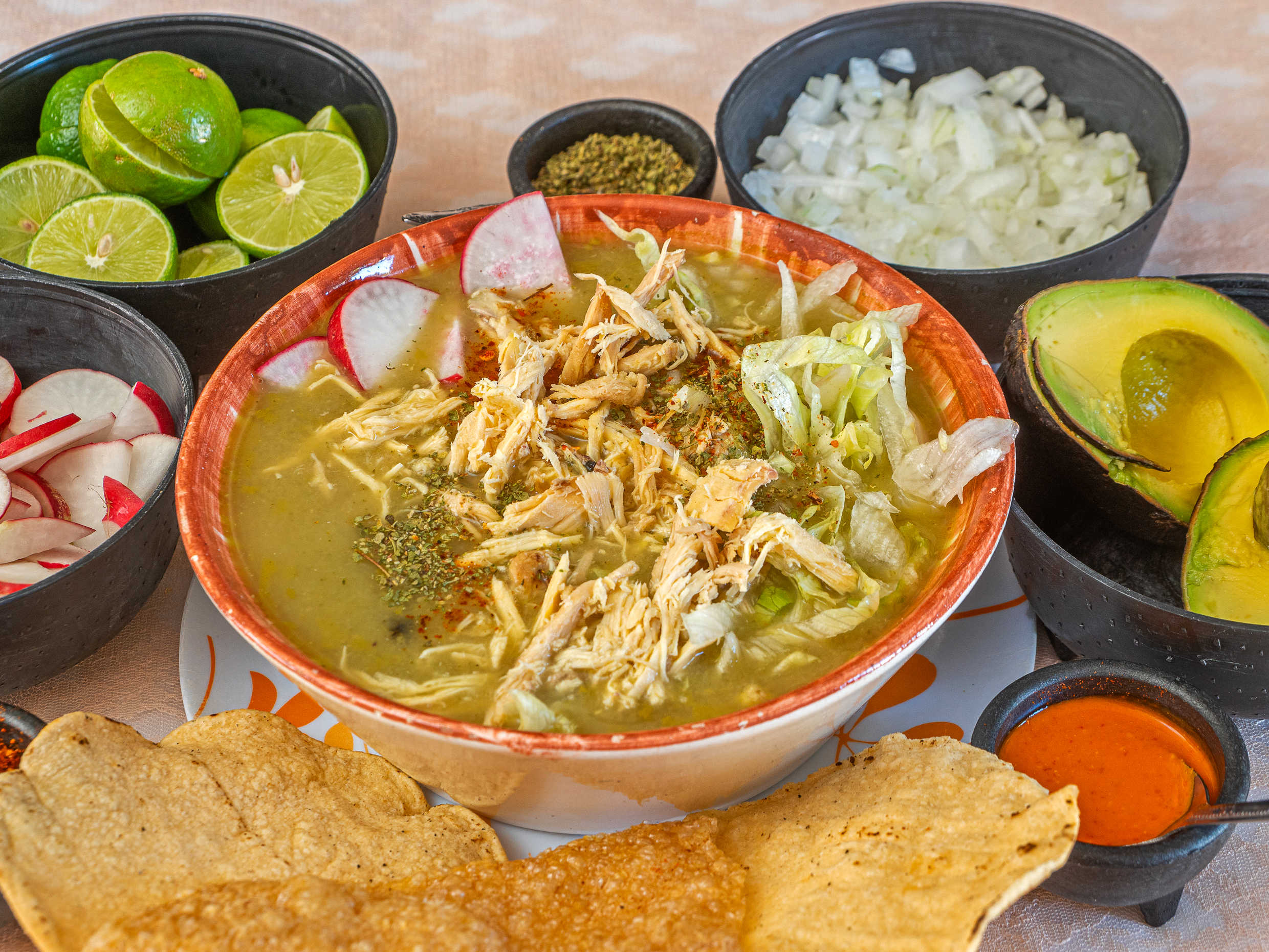 600 Ml. grano 100% natural, lechuga, salsa de vinagre, rábanos, cebolla, limón, aguacate, tostadas, chicharrón, orégano y chile de árbol.