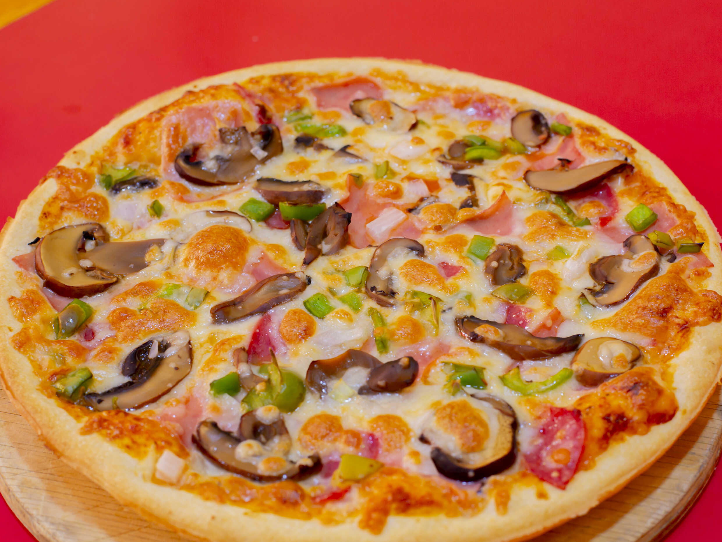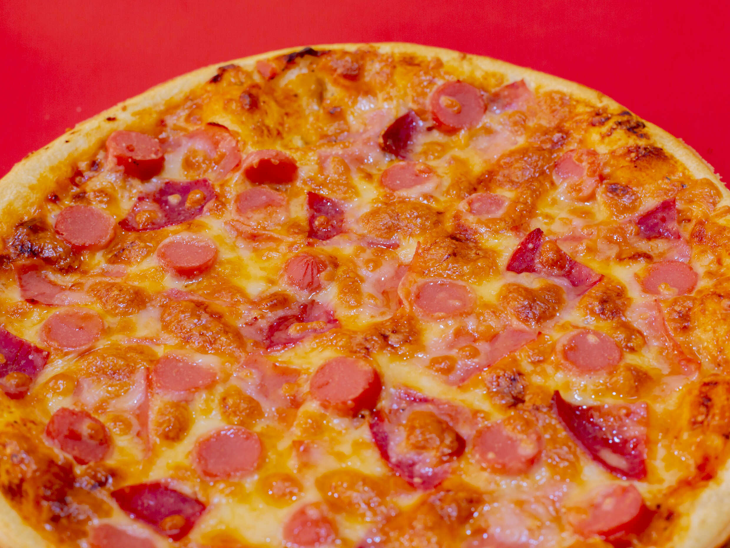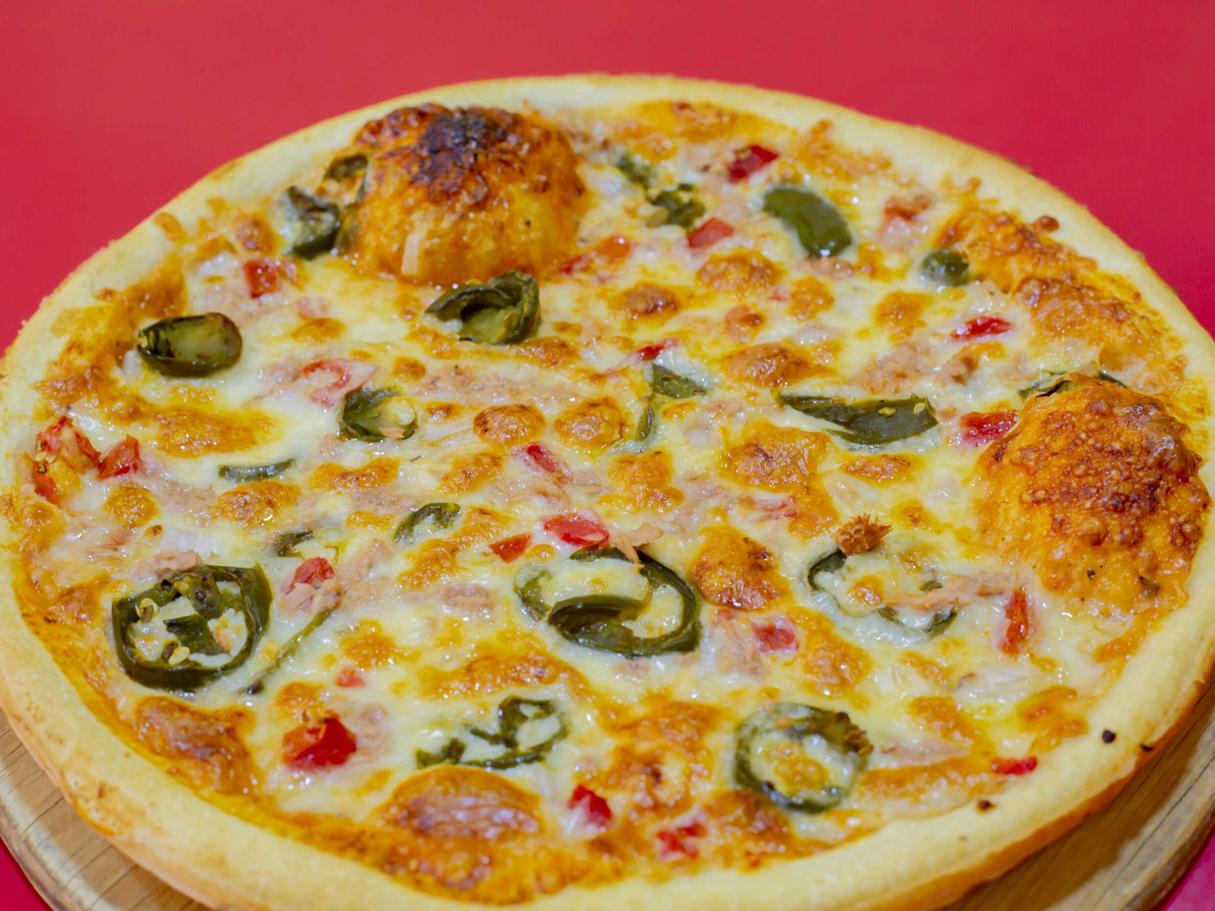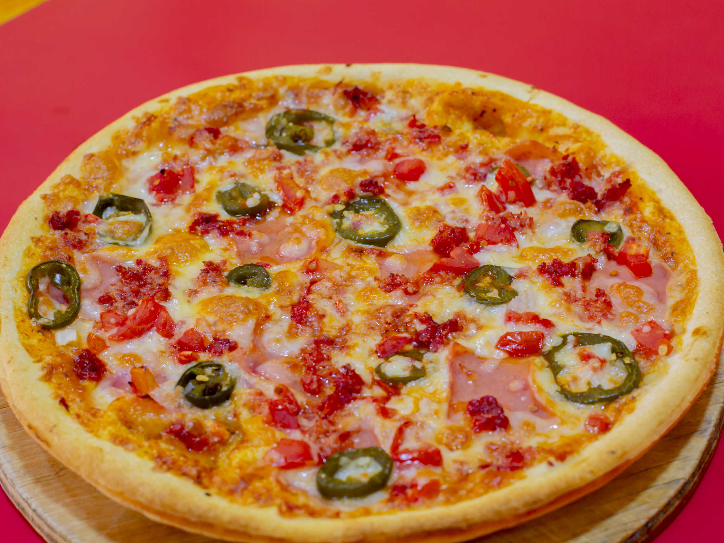 Jamón, chorizo, tocino, jitomate, cebolla y jalapeño.