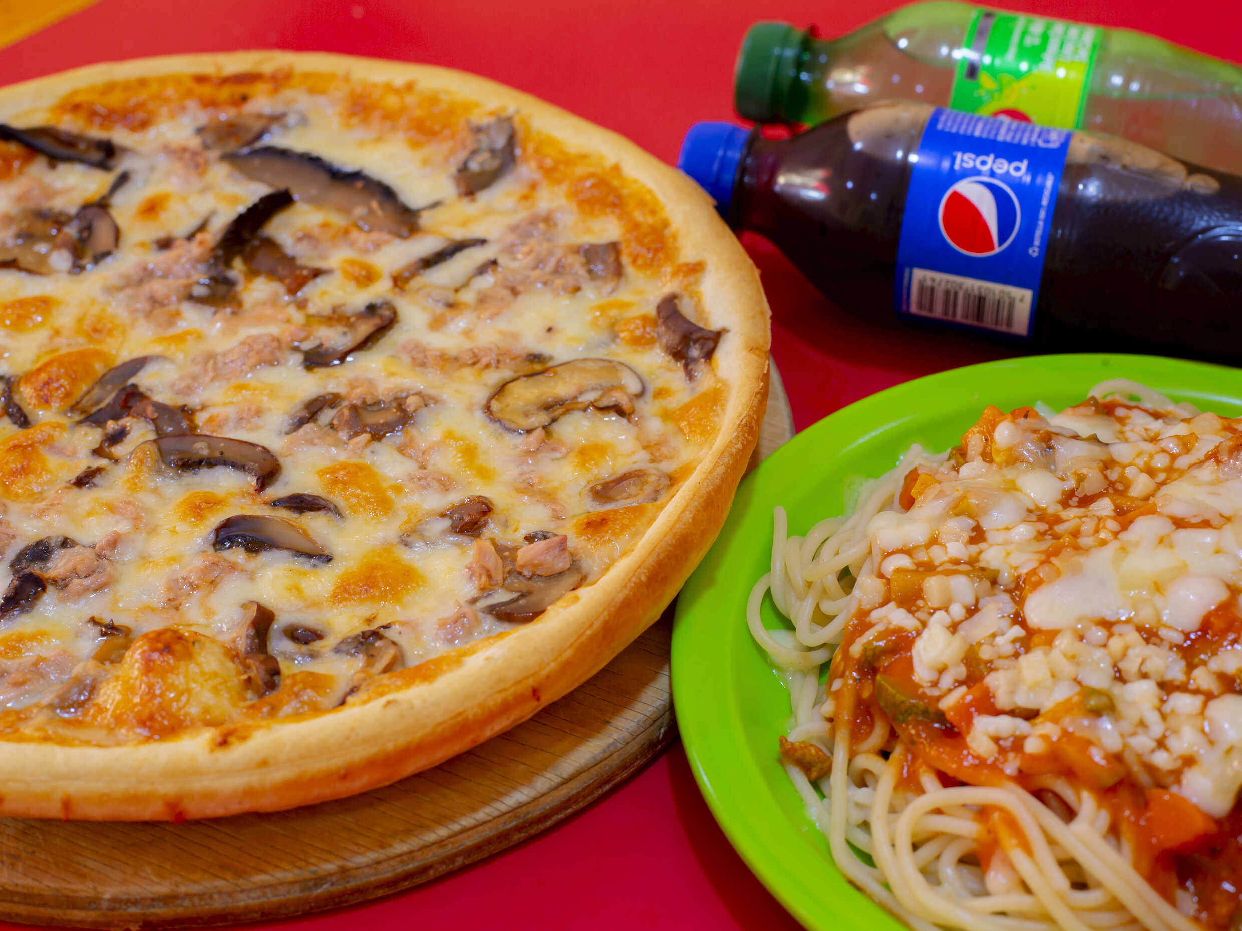 Refresco Chico Sabor a Disponibilidad en Tienda*2 + Spagueti a la Bolognesa*1 + Pizza Mediana de Especialidad*1