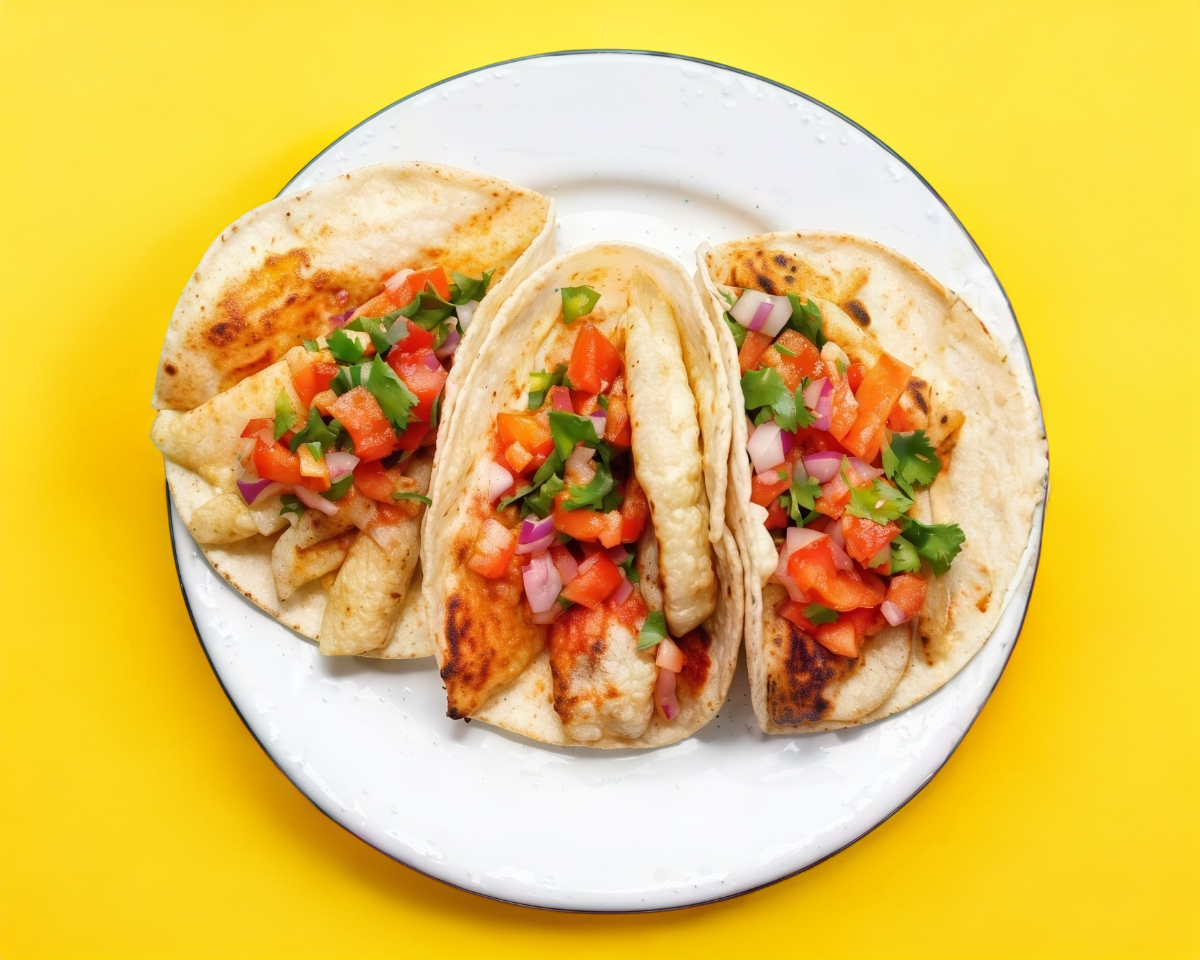 Tacos (3) de machaca de camarón a la mexicana en tortilla de maíz doradita con costra de queso chihuahua.